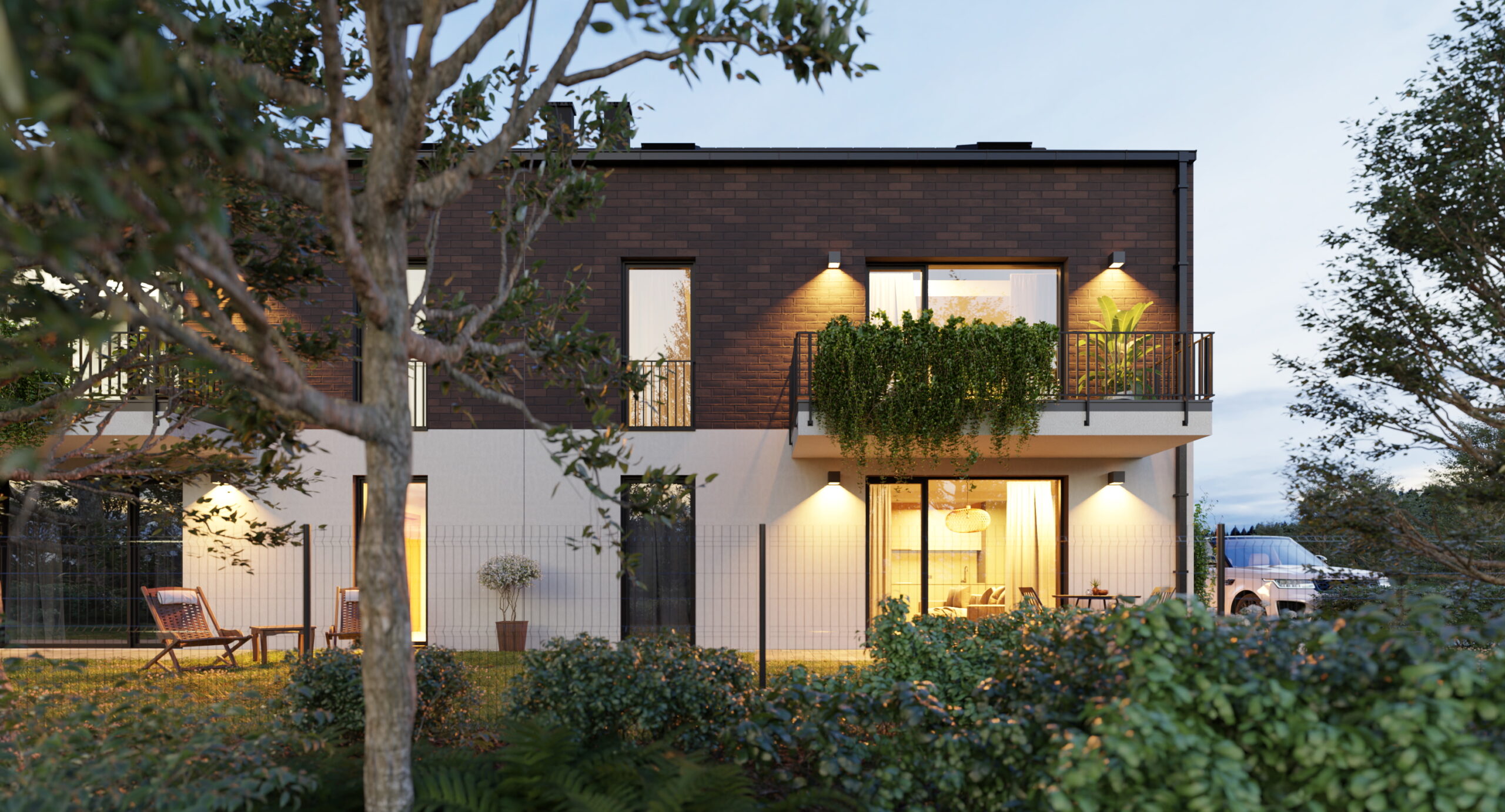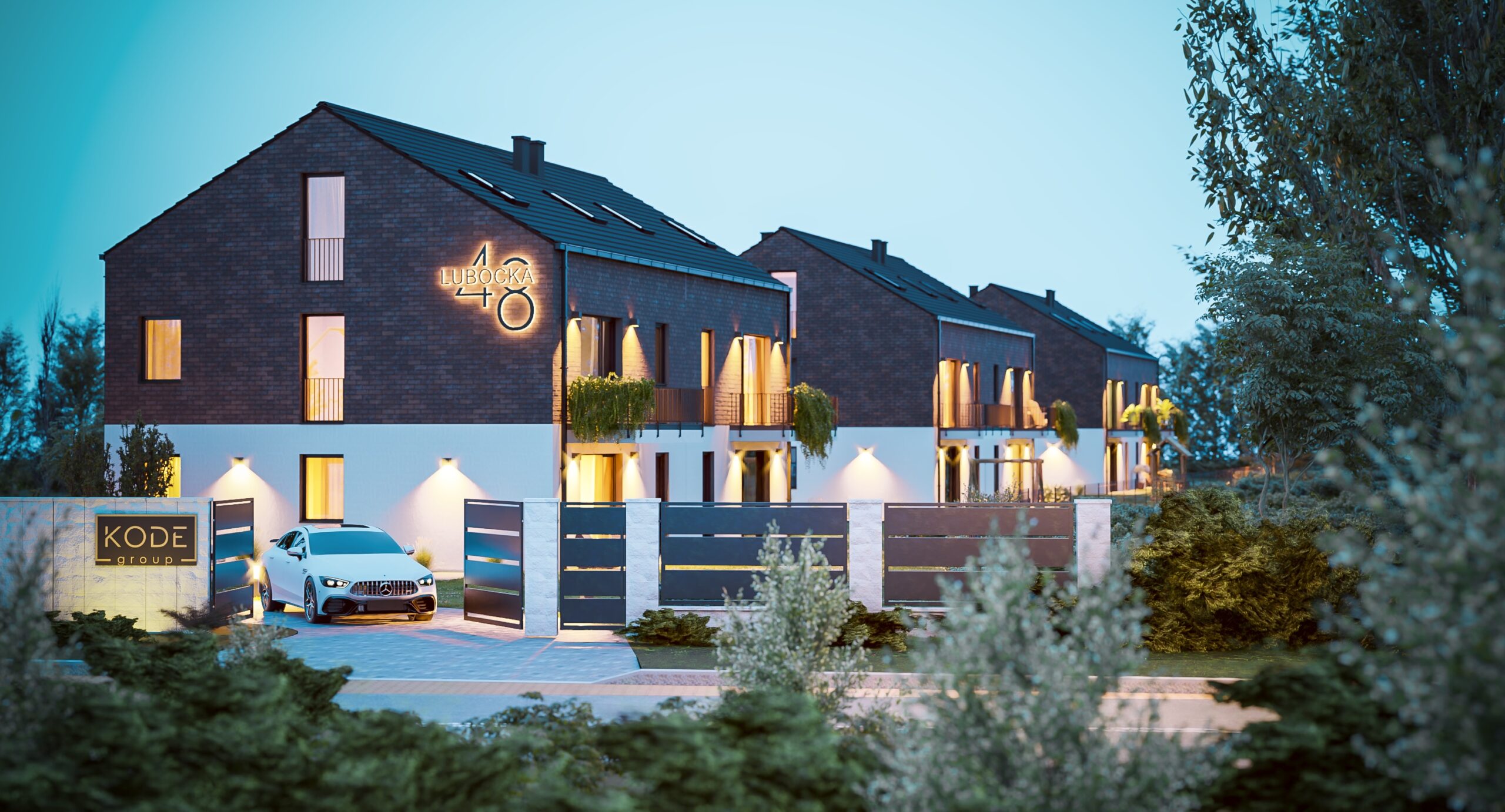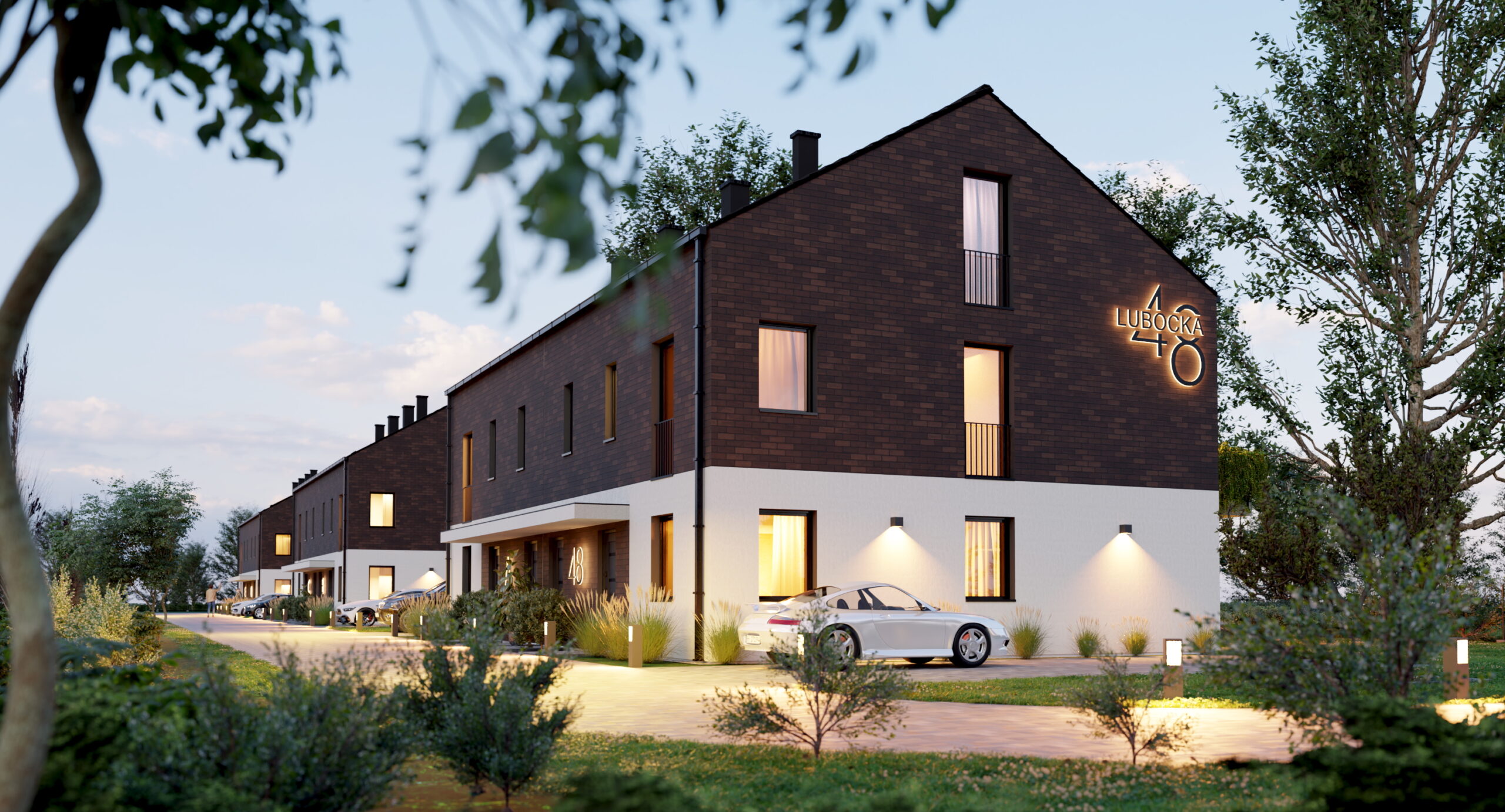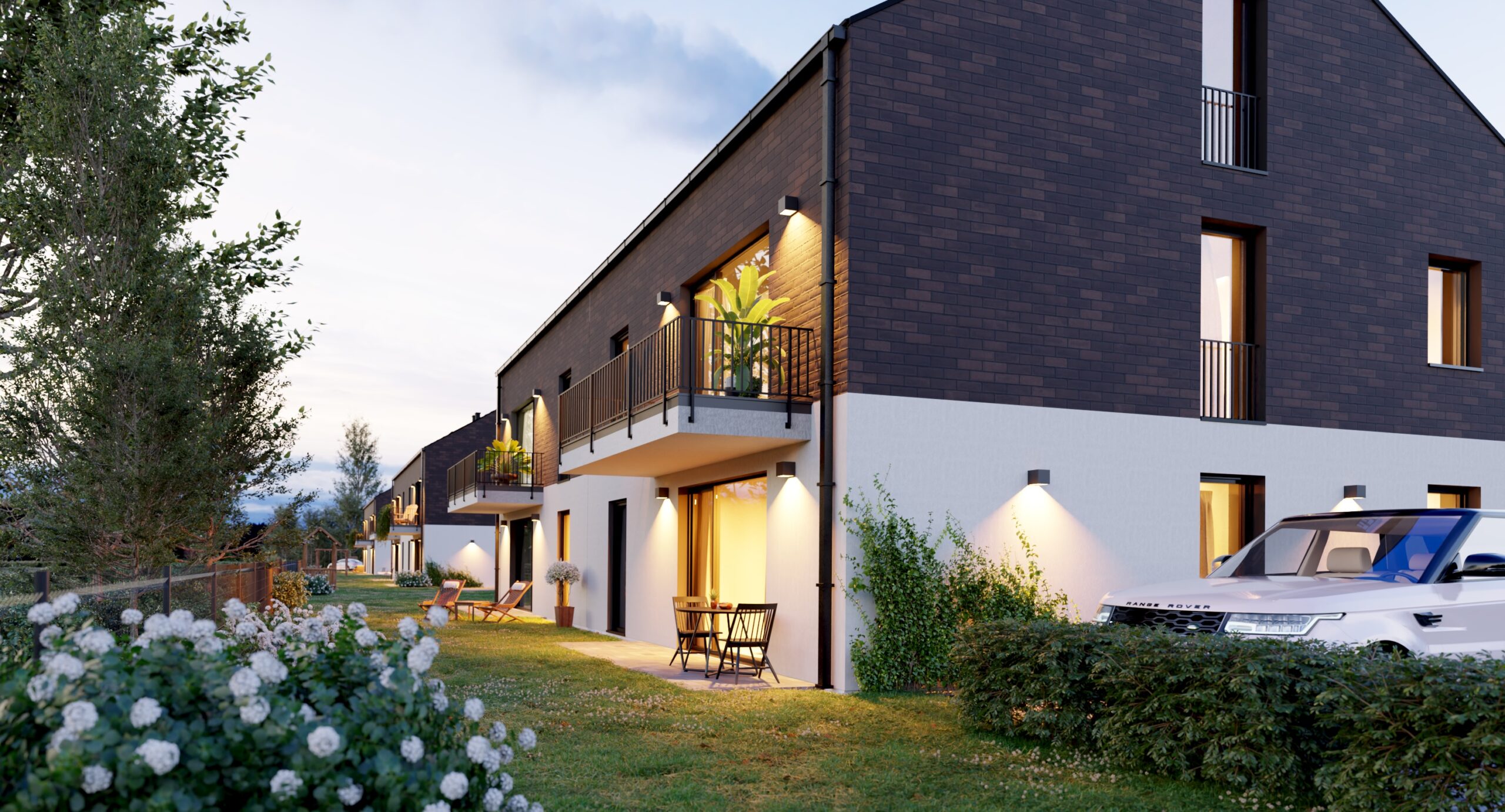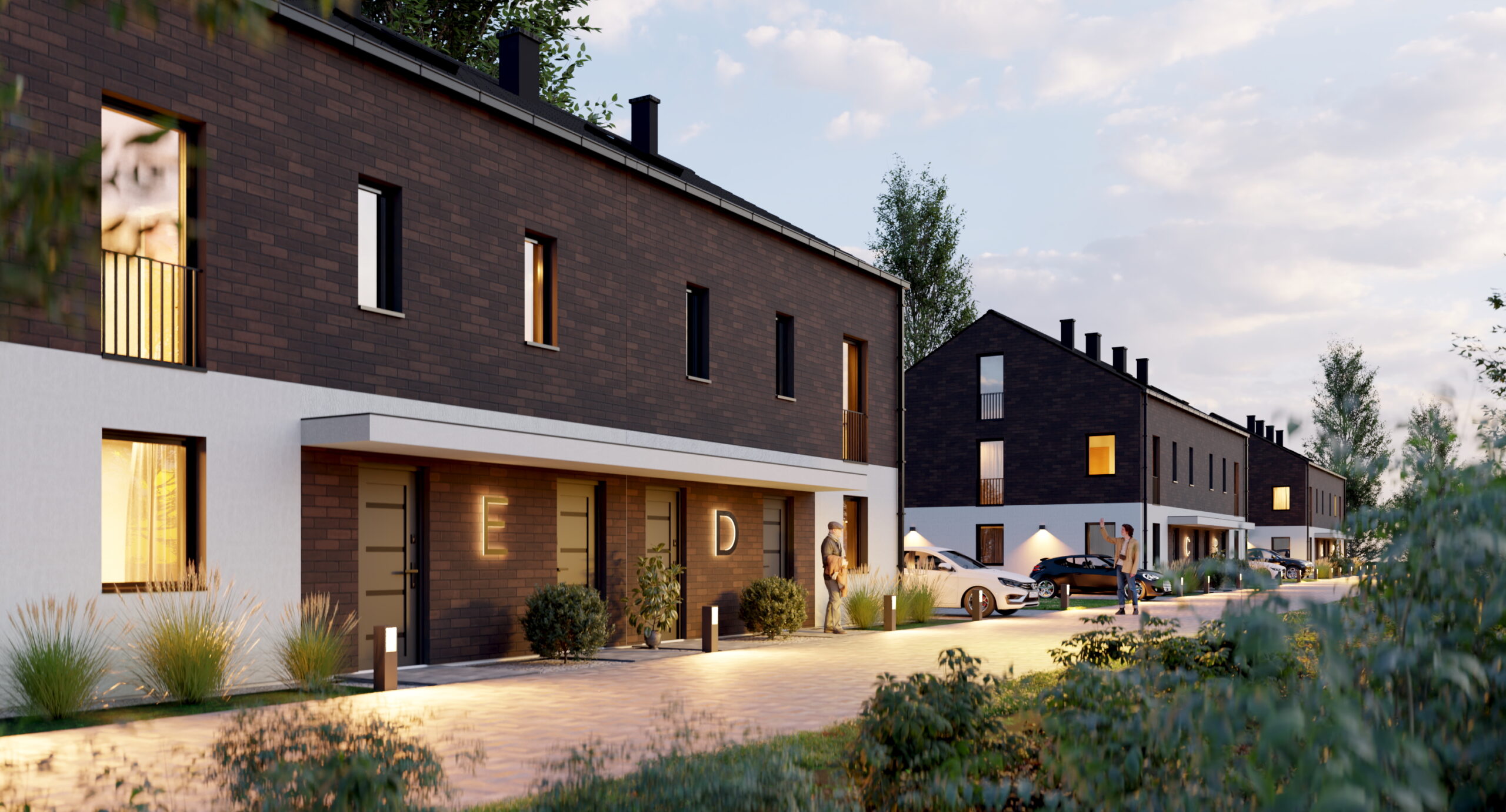 Nowoczesna zewnętrzna forma budynków, stylowe oświetlenie oraz kameralna forma inwestycji.