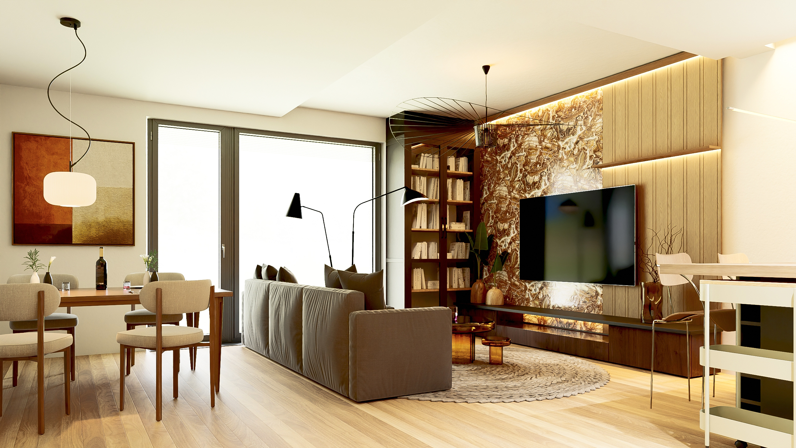 - salon z otwartą kuchnią, duże drzwi tarasowe